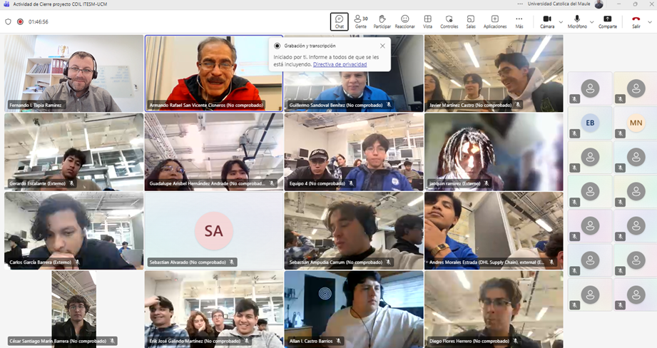 Esta actividad fue coordinada por los académicos Dr. Fernando Tapia Ramírez, profesor del Laboratorio de Circuitos Digitales de la Universidad Católica del Maule, Ing. Fabian Guerrero, Encargado de laboratorios de electrónica, y el Dr. Armando Rafael San Vicente Cisneros, profesor de la asignatura Medición y Análisis de Datos del Instituto Tecnológico de Monterrey. Todos ellos, guiaron las etapas de desarrollo técnico, coordinación intercultural y evaluación final del proyecto, articulando una experiencia formativa conjunta de alta calidad e impacto.