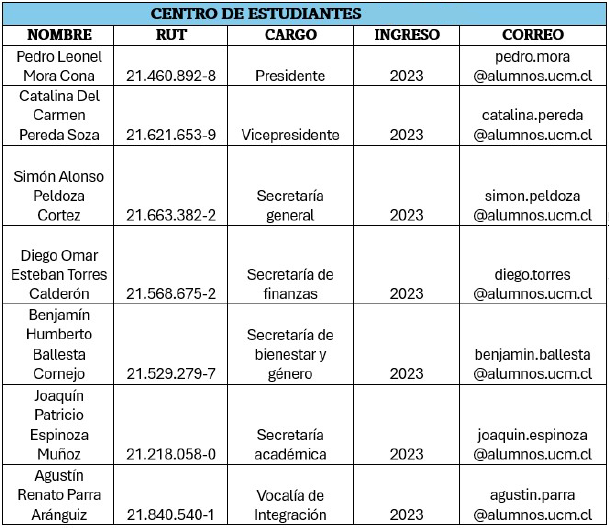 El equipo electo, cuyos integrantes se detallan en la tabla adjunta, ha diseñado un programa que incluye objetivos claros y propuestas concretas para fortalecer la participación estudiantil. Entre ellos, se destaca la expansión de capacitaciones, la promoción de actividades de integración entre generaciones y la creación de un canal de comunicación sólido entre los estudiantes y la institución.