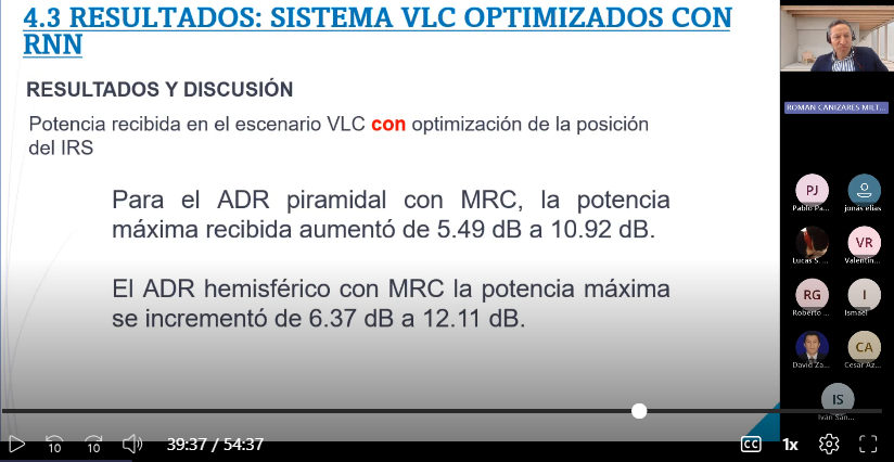 En el marco del proyecto FOVI 240009 (Integración de máquinas de aprendizaje extremo en sistemas de comunicación y/o posicionamiento basados en luz visible), el académico Milton Román Cañizares de la Pontificia Universidad Católica del Ecuador, expuso el tema “Mejoramiento de los sistema VLC usando ADR, IRS y redes neuronales recurrentes (RNN)” que se basa en su disertación doctoral. En el mismo se presentan los limites y alcances del trabajo de investigación, los cuales son: